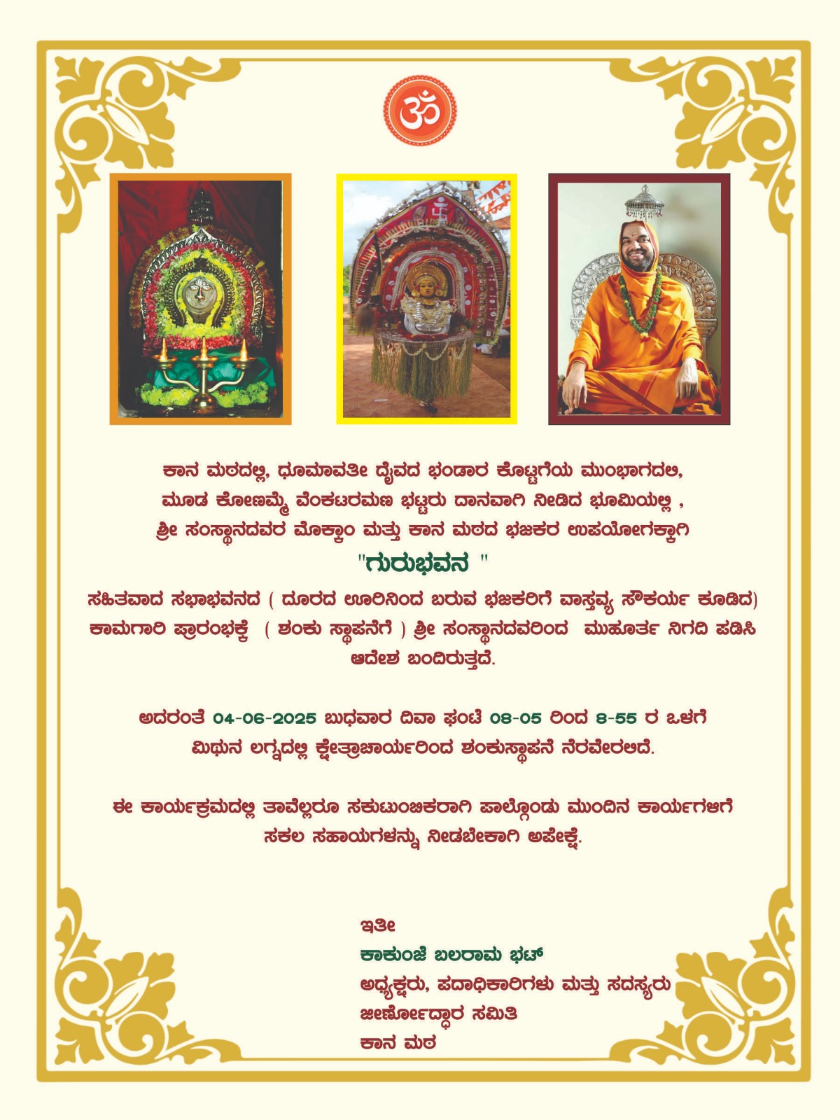 ಕಾನ ಮಠದಲ್ಲಿ ಶ್ರೀಧೂಮಾವತೀ ದೈವದ ಭಂಡಾರ ಕೊಟ್ಟಗೆಯ ಮುಂಭಾಗದಲ್ಲಿ ಮೂಡ ಕೋಣಮ್ಮೆ ವೆಂಕಟರಮಣ ಭಟ್ಟರು ದಾನವಾಗಿ ನೀಡಿದ ಭೂಮಿಯಲ್ಲಿ ಶ್ರೀ ಸಂಸ್ಥಾನದವರ ಮೊಕ್ಕಾಂ ಮತ್ತು ಕಾನ ಮಠದ ಭಜಕರ ಉಪಯೋಗಕ್ಕಾಗಿ ಗುರುಭವನ ಸಹಿತವಾದ ಸಭಾಭವನದ ಕಾಮಗಾರಿ ಪ್ರಾರಂಭಕ್ಕೆ ಶಂಕುಸ್ಥಾಪನೆ ಜೂ. 04 ರಂದು ಬುಧವಾರ ನಡೆಯಲಿದೆ. ಬೆಳಿಗ್ಗೆ 08-05 ರಿಂದ 8-55 ರ ಮಿಥುನ ಲಗ್ನದಲ್ಲಿ ಕ್ಷೇತ್ರಾಚಾರ್ಯರಿಂದ ಶಂಕುಸ್ಥಾಪನೆ ನೆರವೇರಲಿದೆ. ಈ ಕಾರ್ಯಕ್ರಮದಲ್ಲಿ ತಾವೆಲ್ಲರೂ ಸಕುಟುಂಬಿಕರಾಗಿ ಪಾಲ್ಗೊಂಡು ಮುಂದಿನ ಕಾರ್ಯಗಳಿಗೆ ಸಕಲ ಸಹಾಯಗಳನ್ನು ನೀಡ ಬೇಕಾಗಿ ಅಪೇ
